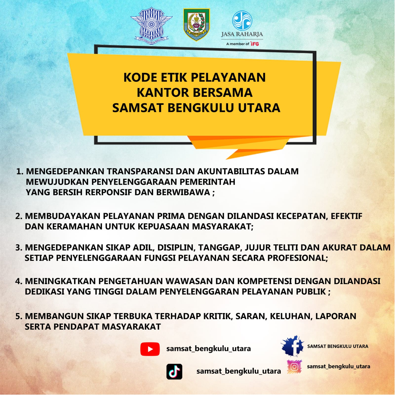 DENGAN INI KAMI PETUGAS PELAKSANA PELAYANAN DI KANTOR BERSAMA SAMSAT BENGKULU UTARA MENYATAKAN SANGGUP MEYELENGGARAKAN PELAYANAN SESUAI STANDAR PELAYANAN YANG TELAH DI TETAPKAN DAN APA BILA TIDAK MENEPATI JANJI INI, KAMI SIAP MENERIMA SANKSI SESUAI PERATURAN PERUNDANG-UNDANGAN YANG BERLAKU